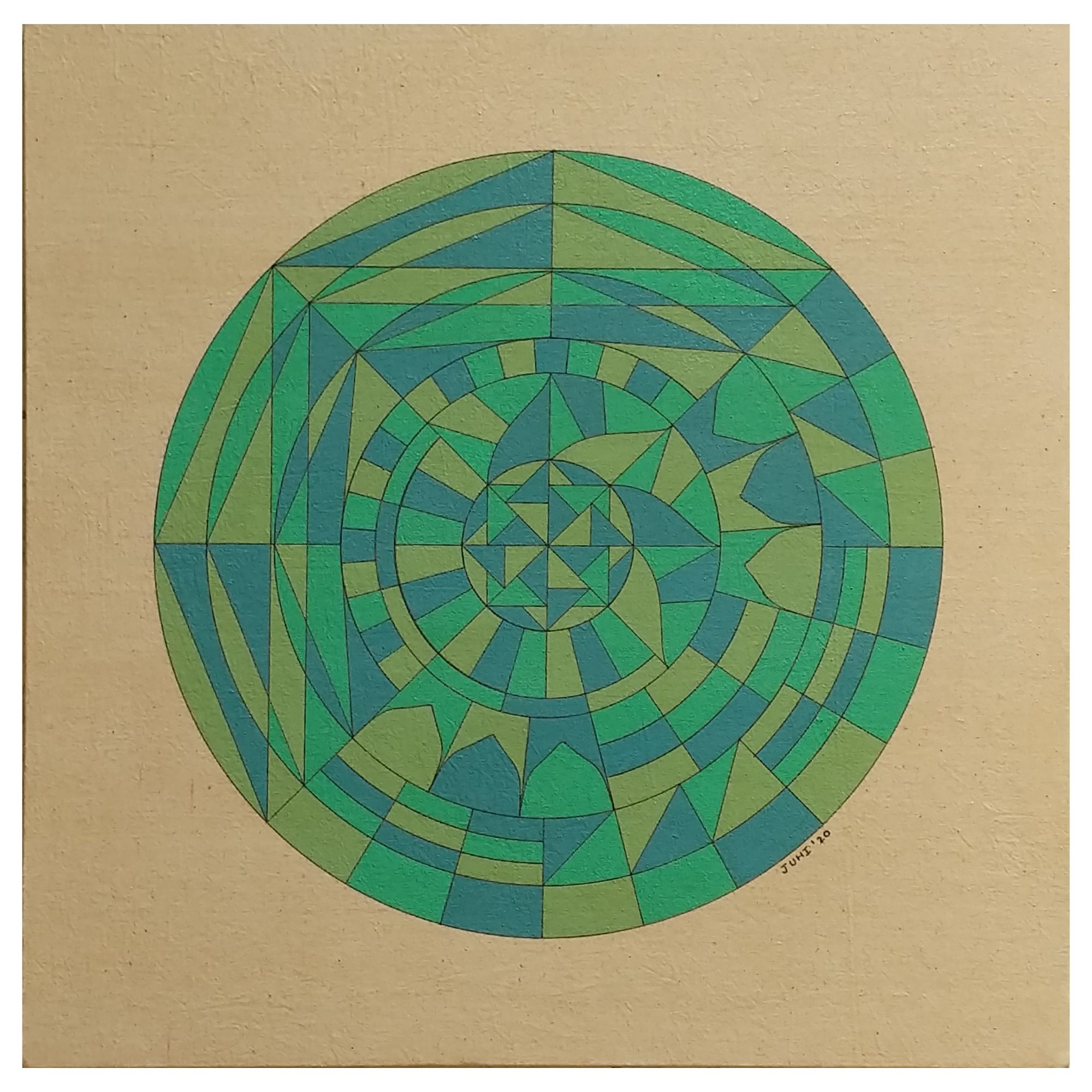 This mandala resembles a peacock dancing on ochre earth. It takes the viewer on a journey through shapes, starting from the centre point and proceeding clockwise. Here, patterns are the protagonist (main character), which form and break at just the right place. This creates the illusion of spiralling outward from the centre to the periphery or the border. The curves soften and angles sharply direct the movement of the eye, mimicking the dance of the majestic peacock.