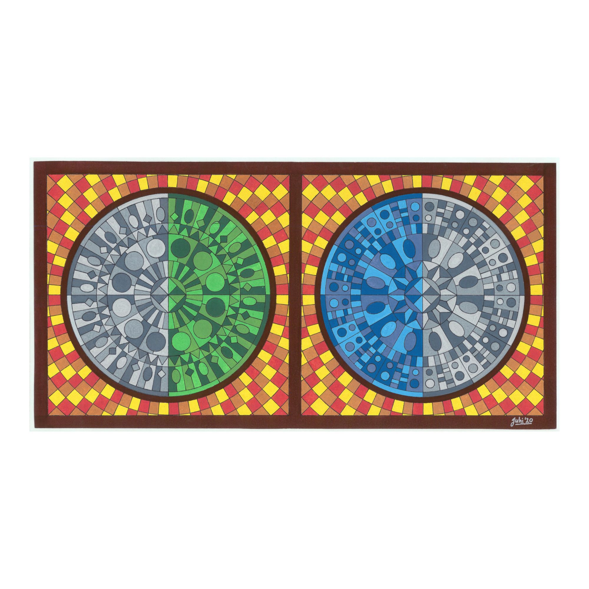 This is a twin mandala where each mandala somewhat mirrors the other. The theme of this artwork is partnership, which basically means establishing a harmony in duality. The backgrounds of each mandala are moving in opposing directions and creating an illusion of movement. The two mandala are similar to each other because each is half in colour and half in greyscale. They are similar internally because they follow the same patterns. Thus, this mandala talks of both internal and external harmony.